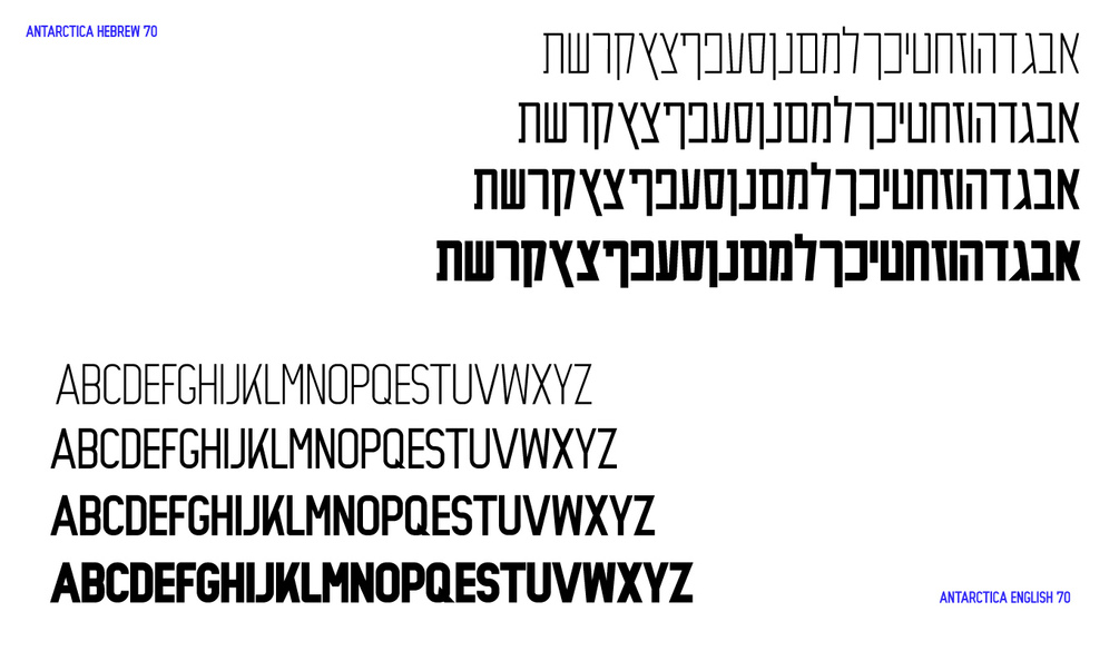 גופן אנטאקטיקה בעל 4 משקלים: דקיק, דק, רגיל ובולד